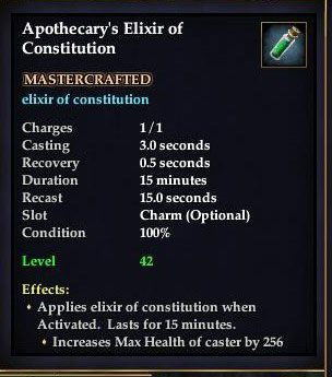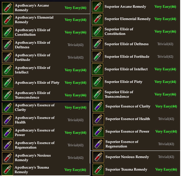 NOTE: This page shows only the potions craftable post LU#24 (6/14/06). Potions crafted prior to that date have different names and effects. The recipes for potions craftable prior to LU#24 are no longer available.